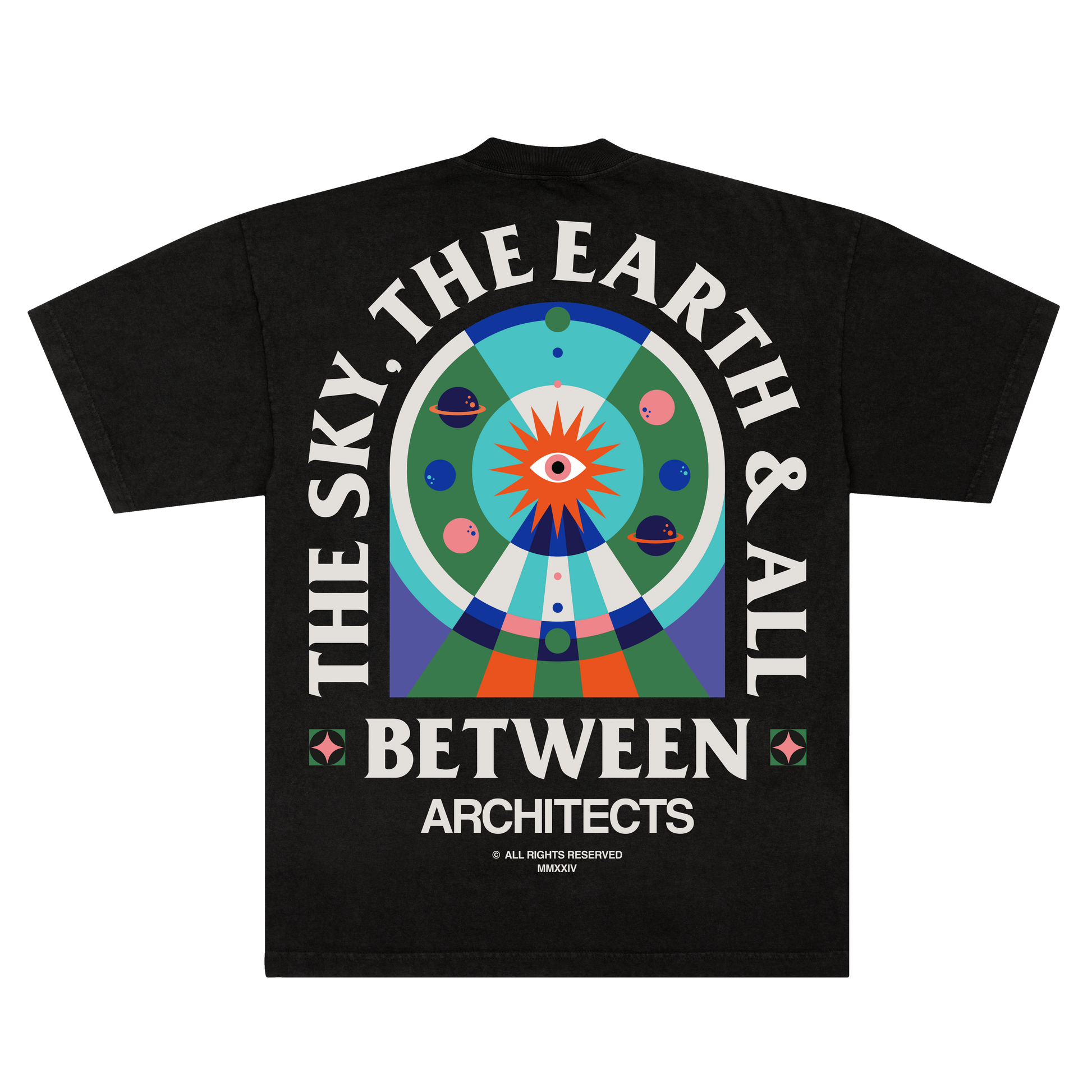 Architects All Between Tour graphics printed on the front and back of a black, unisex tee.